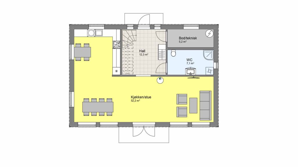Linnerud er et klassisk hus i halvannen etasje for flate tomter. Her kommer du inn i en romslig hall med trapp, som leder deg inn til stue og kjøkken på over 50 kvadratmeter.