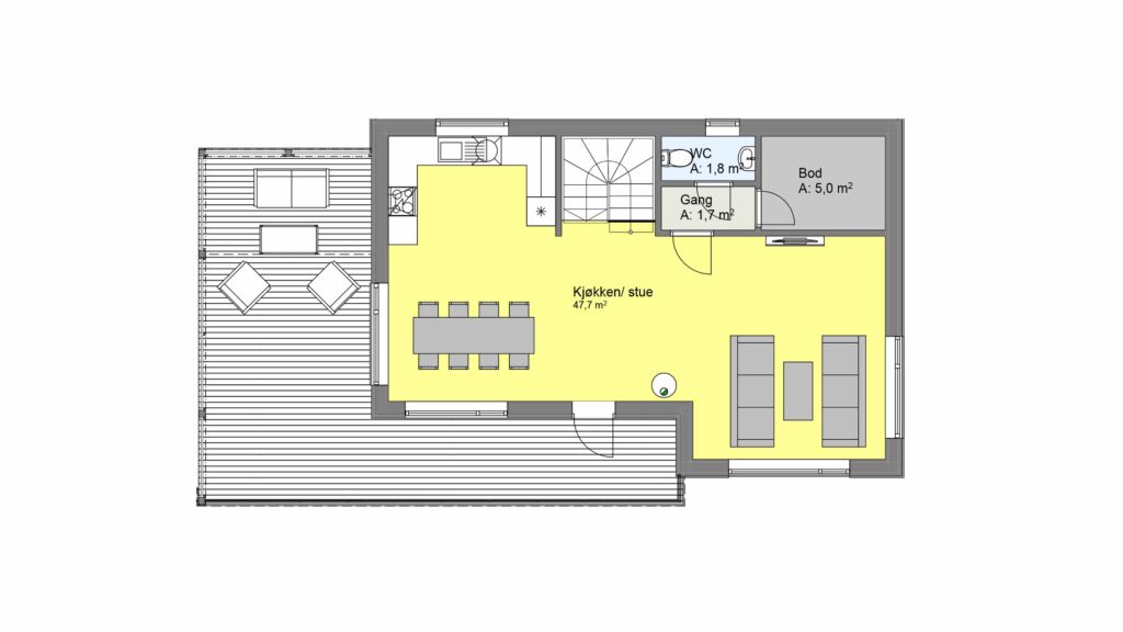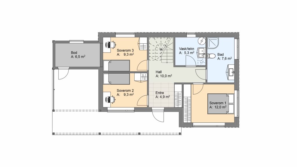 I første etasje kommer du inn i en romslig hall med trapp, som gir deg tilgang til tre soverom, bod og bad. Oppe finner du et åpent stue og kjøkkenområde som gir en luftig romfølelse, og her er det plass til å ha hele vennegjengen på middagsbesøk.