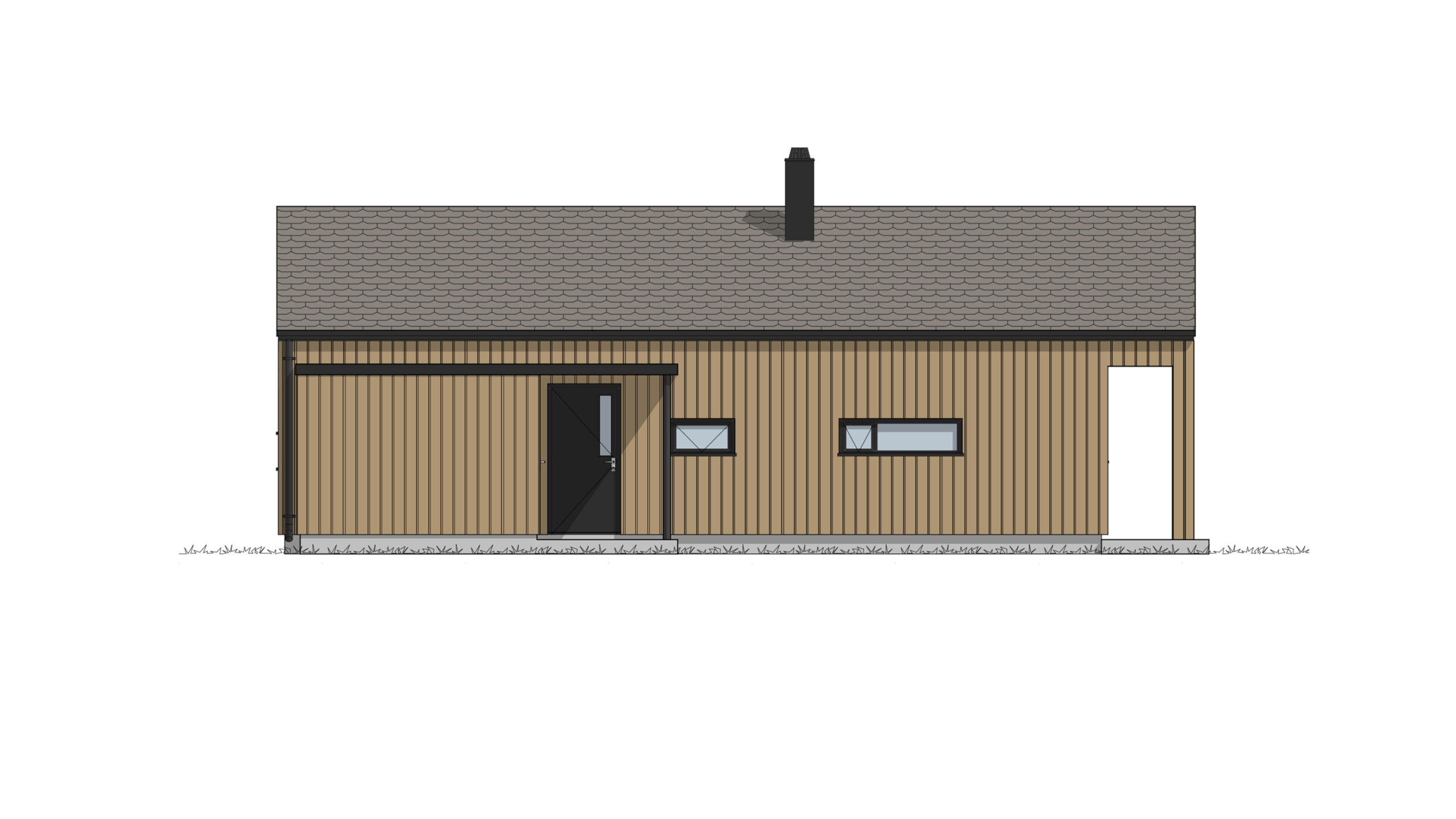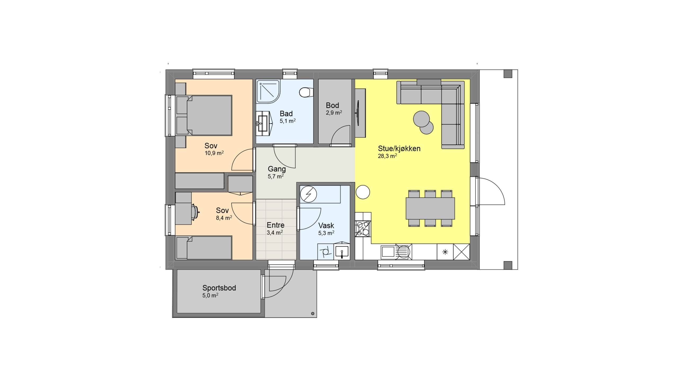Den åpne stue- og kjøkkenløsningen er den samme som Økosmart 1 og 3 har, og det har de samme kjennetegnene med de store vinduene og den overbygde uteplassen. Dette er et hus som passer de fleste av livets faser, og er et godt valg for både økonomi og komfort.
