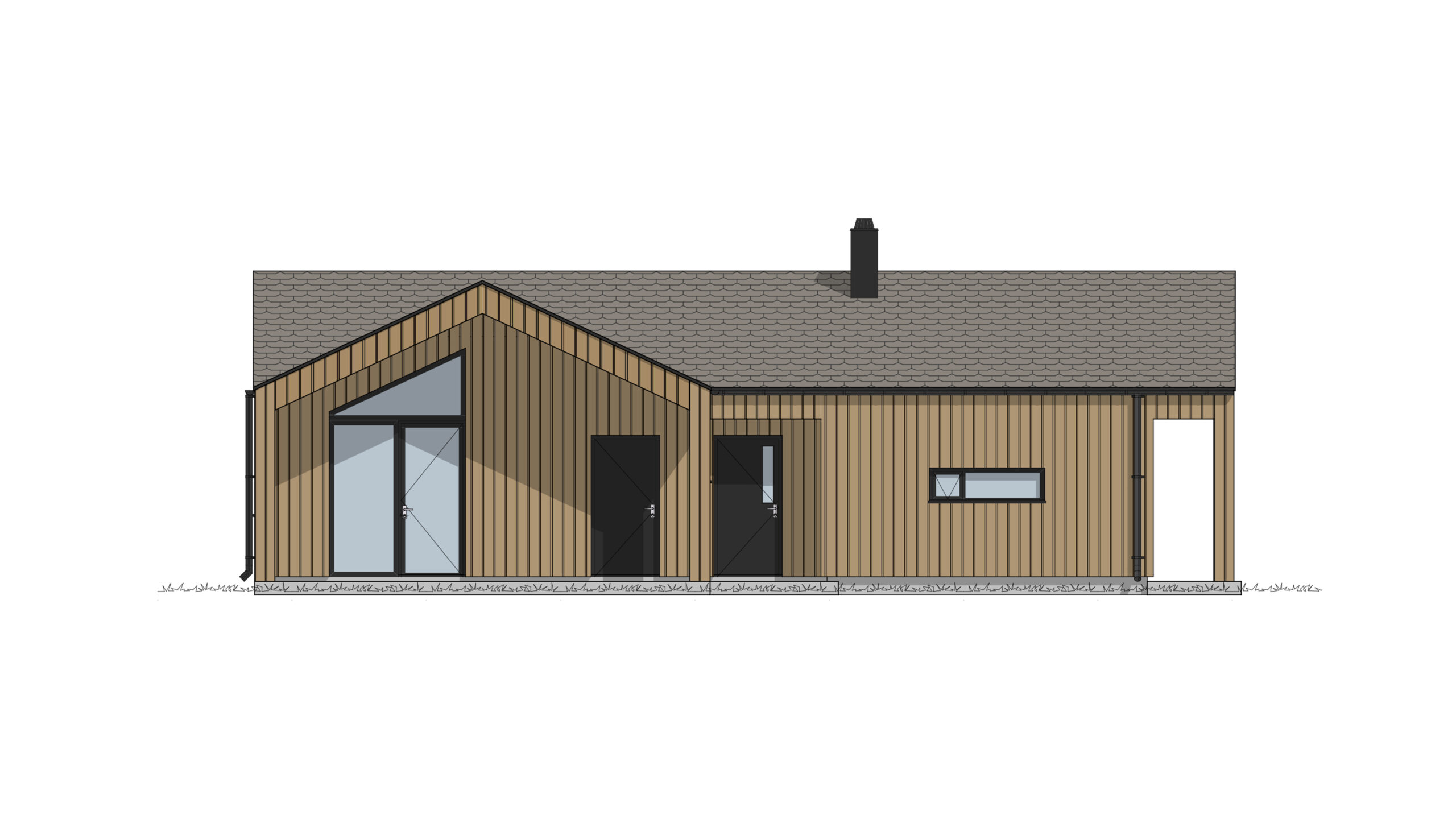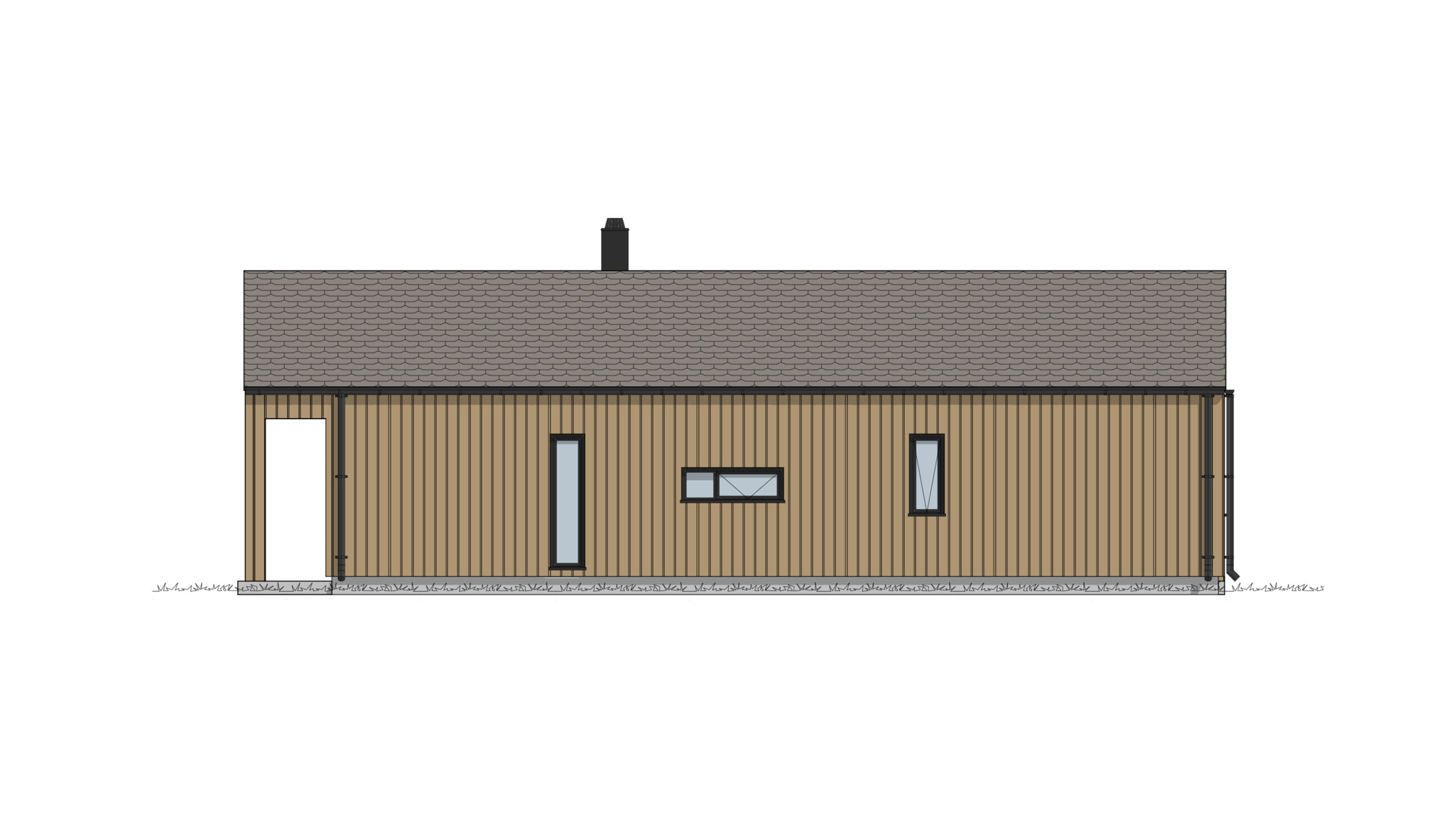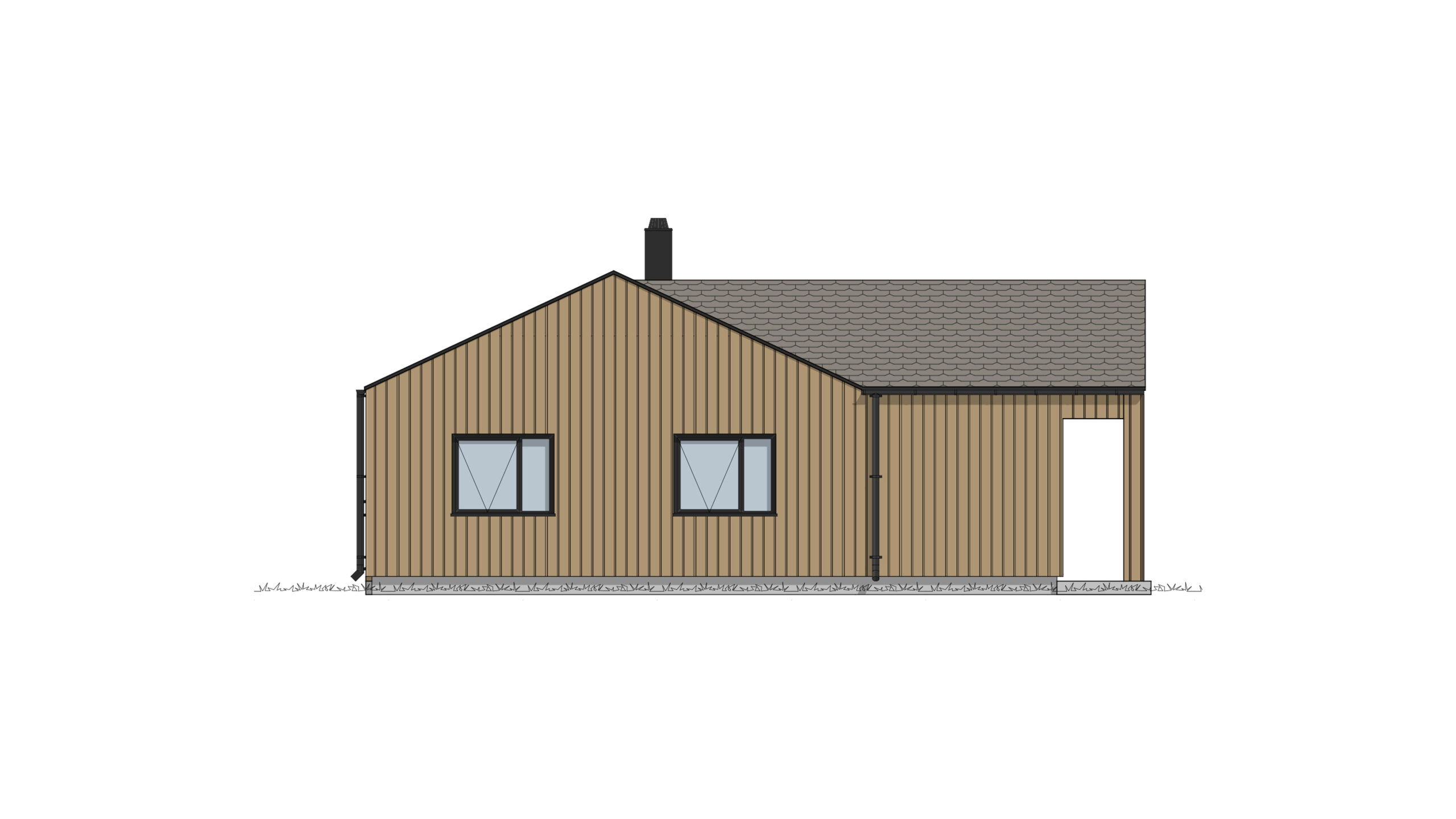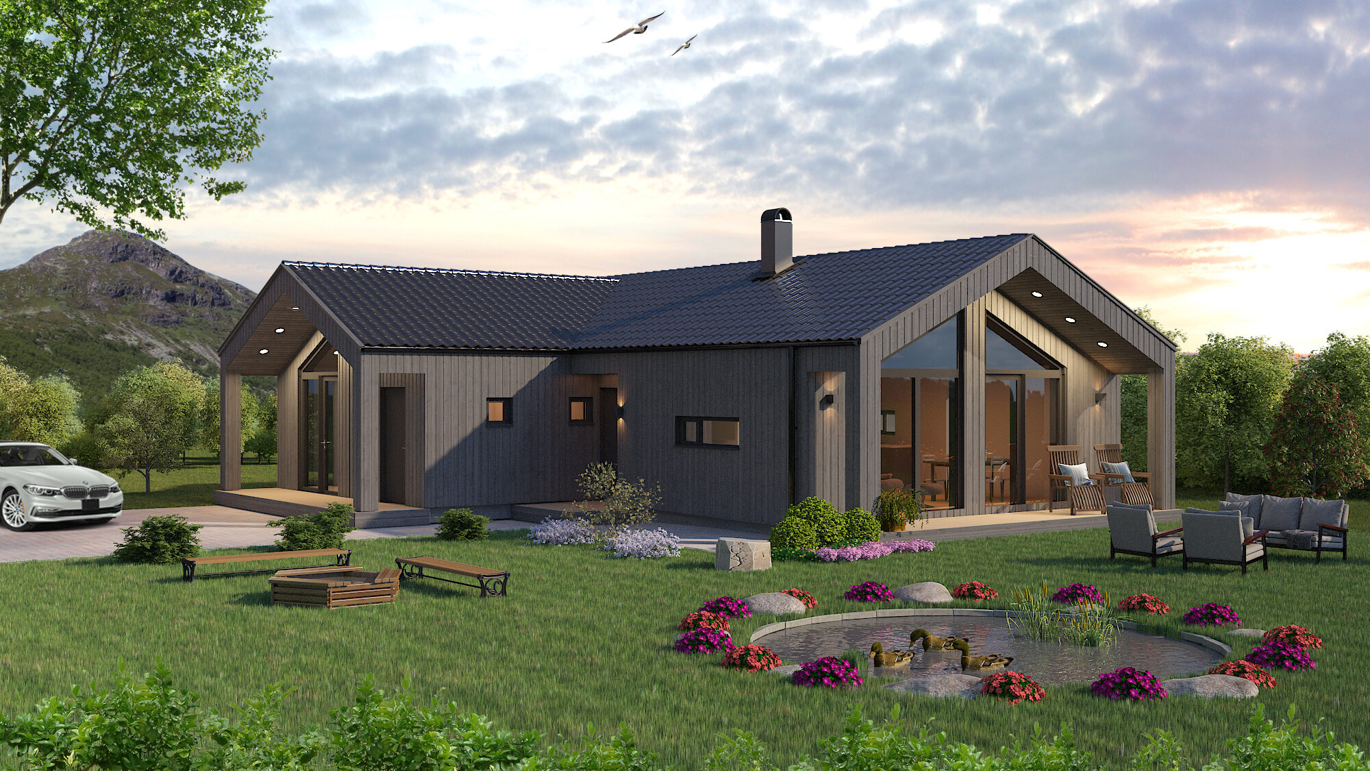 Økosmart 4 er med sine tre soverom et innholdsrikt og flott familiehjem. Dette er et vinkelhus som har overbygget terrasse i både stue- og soveromsdel, og soverommet har de samme store vindusflatene som stuen.
