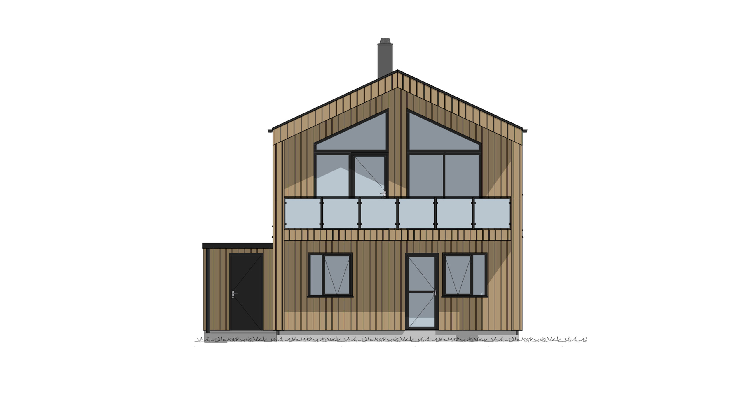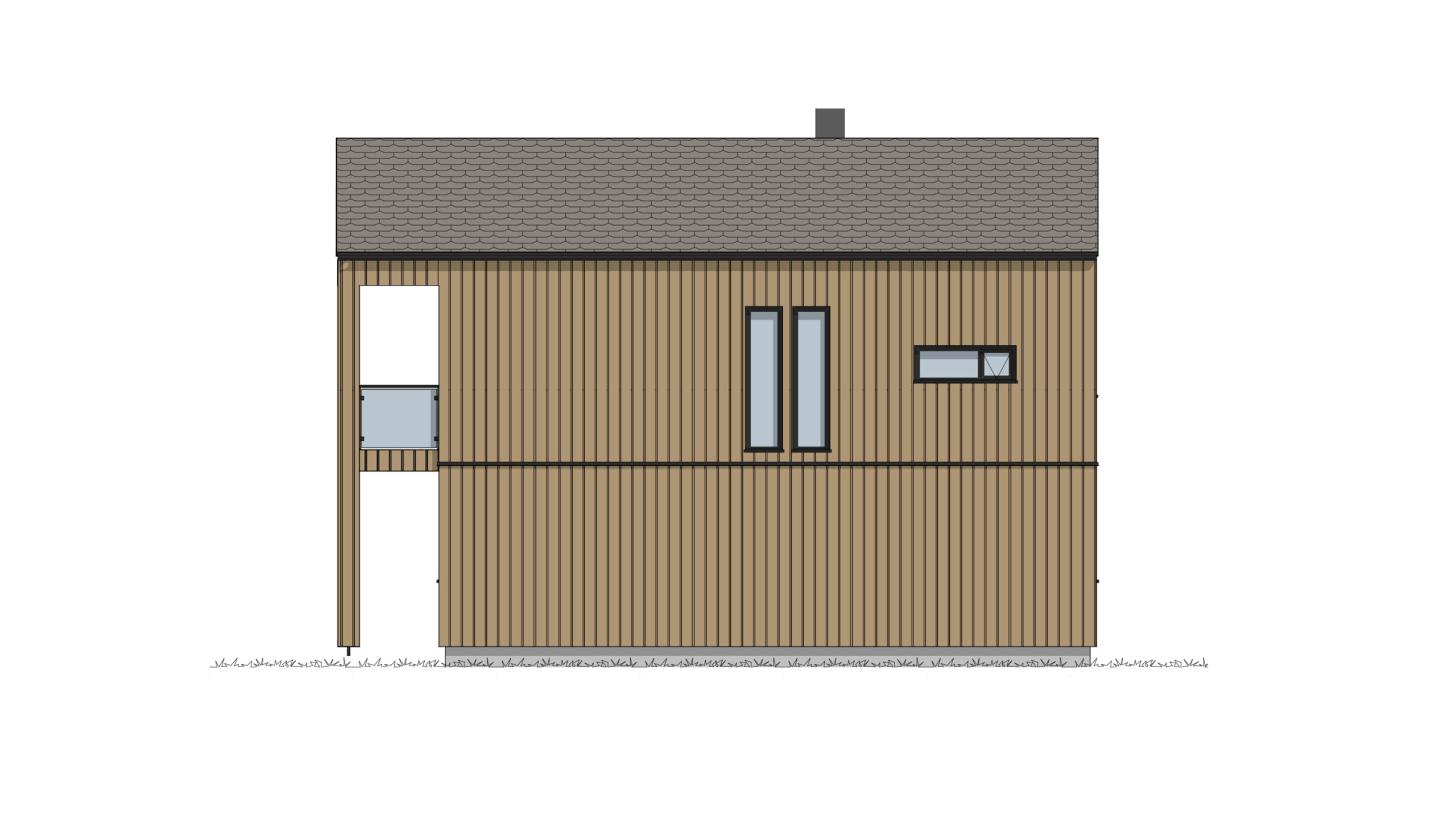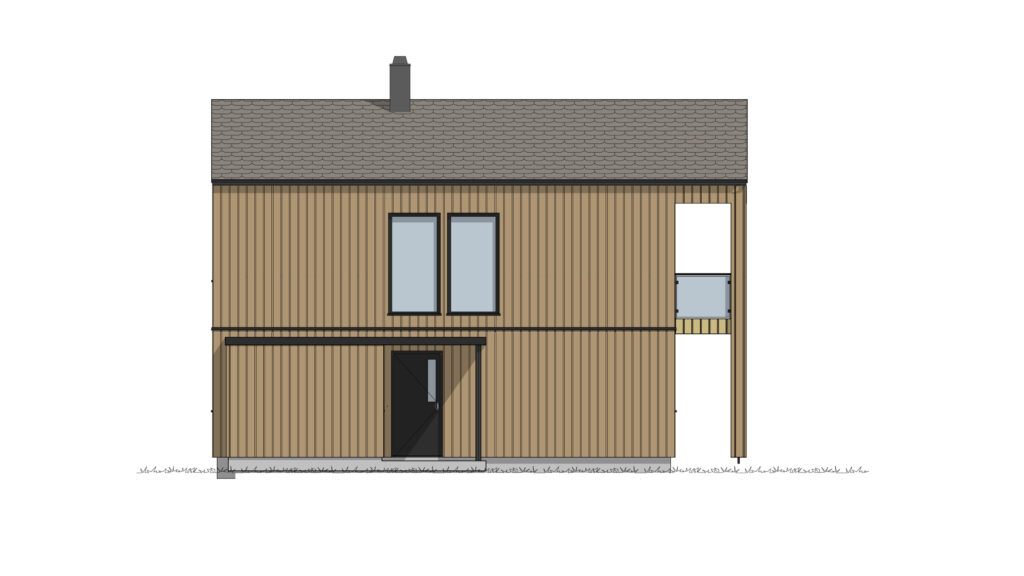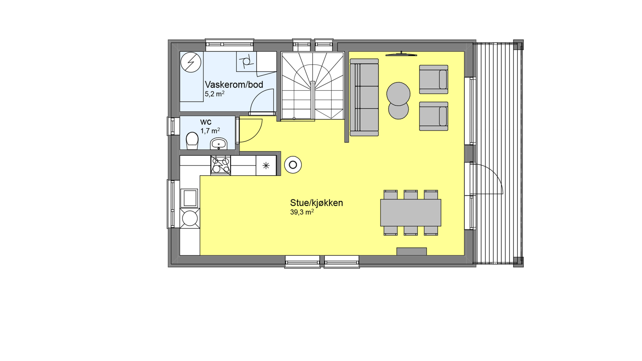 I andre etasje finner du et åpent stue- og kjøkkenområde som gir en luftig følelse, med store vinduer og utgang til overbygget balkong. WC og vaskerom finnes også i andre etasje, og gjør huset komplett og effektivt.