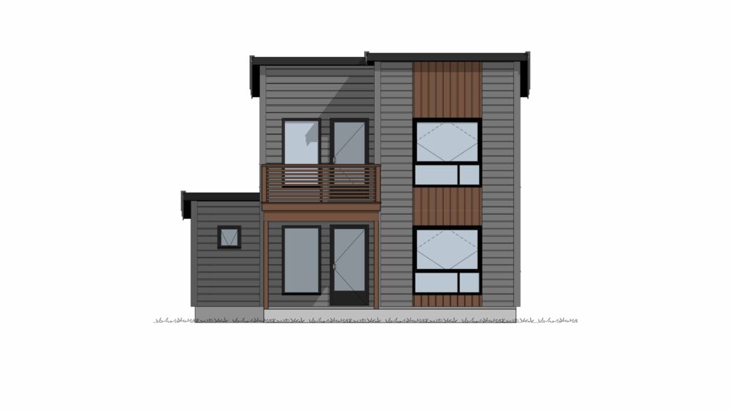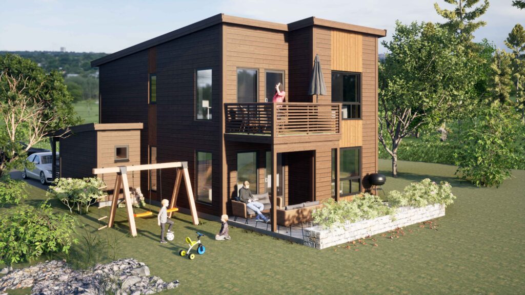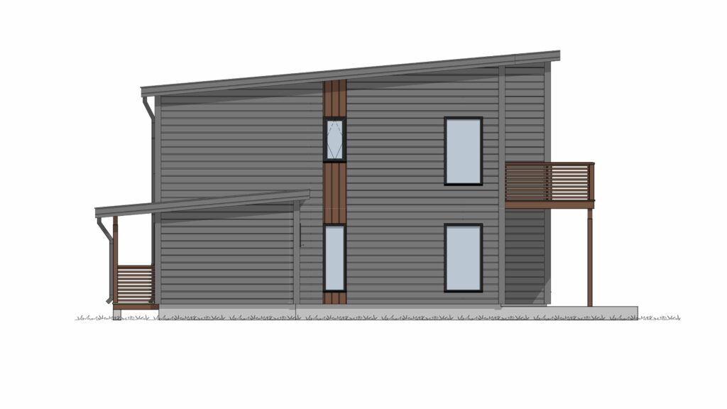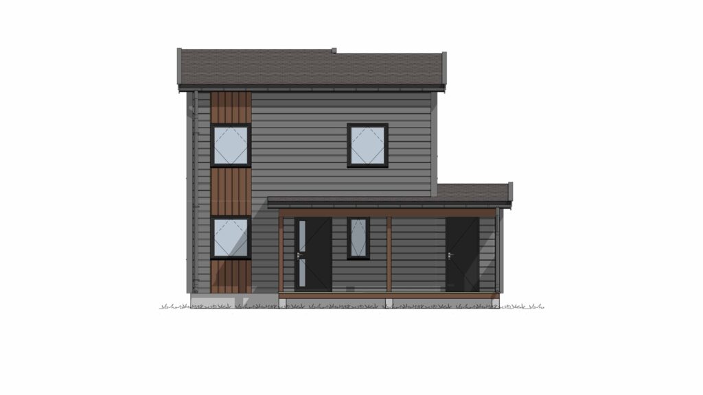 Et overbygget inngangsparti ønsker deg velkommen, og uteplassen på andre siden av huset er også delvis overbygget. Huset har pulttak, og har både stående og liggende panel i forskjellige nyanser som gir liv til fasadene.