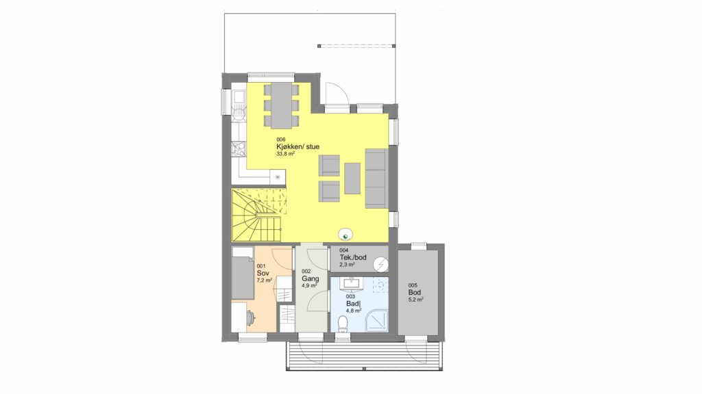 Både innvendig og utvendig bod er på plass, og stuen oppe har også kontorplass og utgang til balkong.