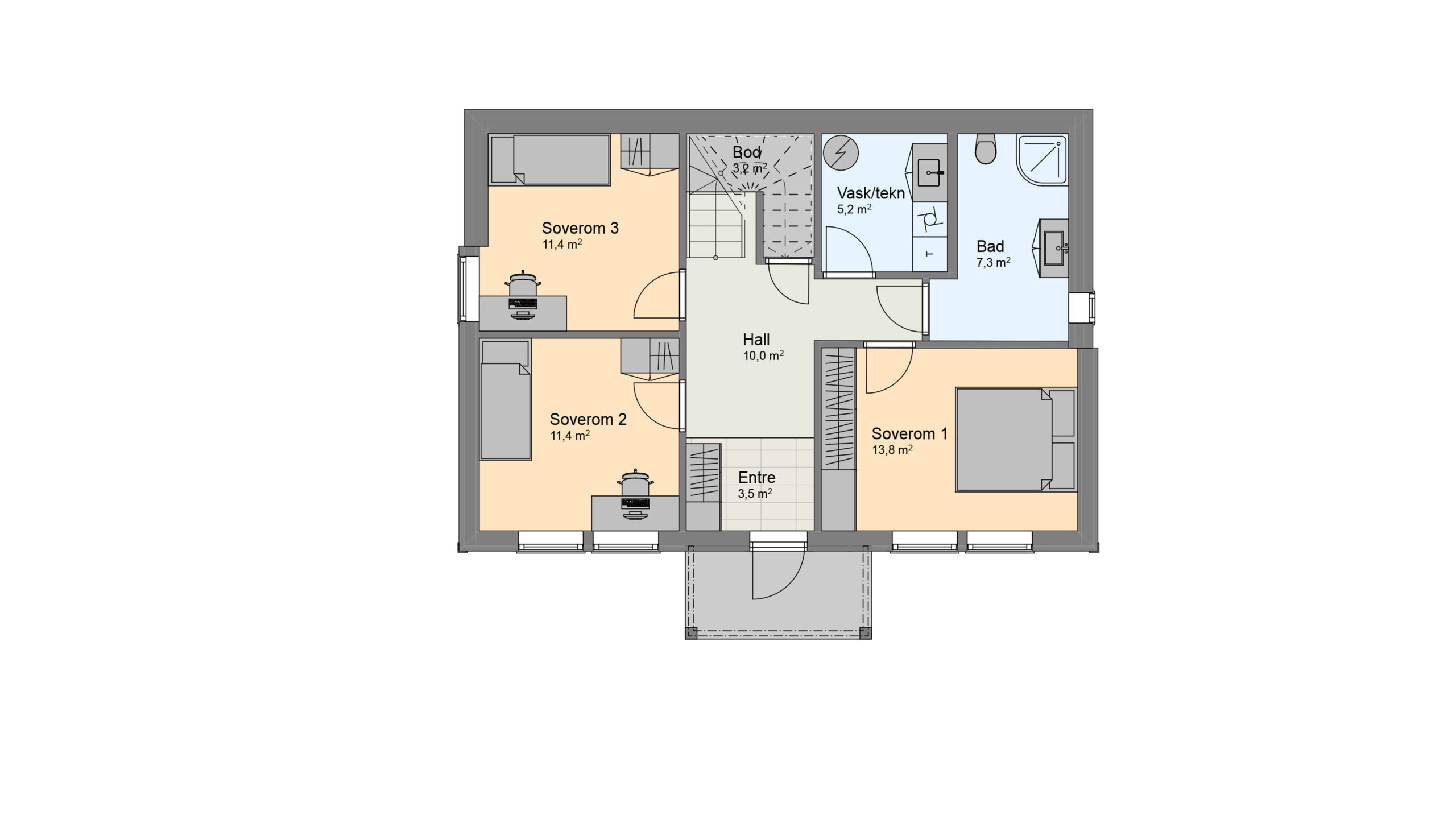 Første etasje inneholder tre gode soverom, hall med trapp, bad og vaskerom. En praktisk bod under trappen gir lagringsplass. I andre etasje kommer du opp i en romslig stue med plass til stort et spisebord hvor familie og venner kan nyte lange middager. Åpen løsning inn til kjøkkenet gir en åpen og luftig følelse sammen med mange vinduer og utgang til veranda. Denne etasjen inneholder også wc-rom og soverom. Spone er et innholdsrikt og praktisk hus med alt en familie trenger!